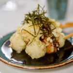 Preheat the frying oil until 150°C. Sprinkle a little of the tempura batter into the hot fat to create small lumps of crispy batter. Dust the mochi with flour and dip the mochi into the batter. Slowly immerse the mochi into the hot frying fat and with a strainer lightly push the prefried tempura batter onto the mochi. That will create a thicker layer of crispy tempura batter. Deep fry until golden brown.
